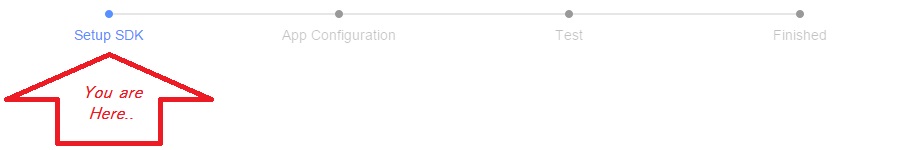- As you click on "Next" you will get a similar window, shown below. This screen will share the First Step, "Setup SDK" with you and share others.