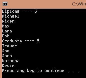 Here we passed the first key, x.key.StudentType, into a new anonymous type StudentType. Then we passed the second key in the same manner and in the end we passed the third anonymous type that expects a new anonymous type of IOrderedEnumerable of Student that will provide us the collection of students present in the StudentList.