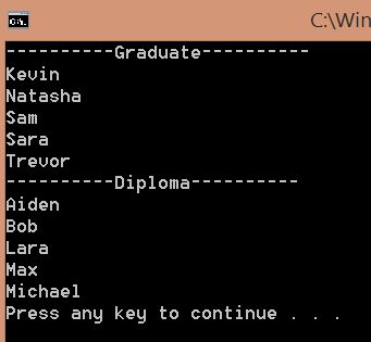 - Console.WriteLine("{0} Students with Gender {1} ", item.StudentType, item.Gender);