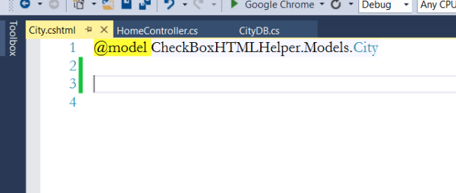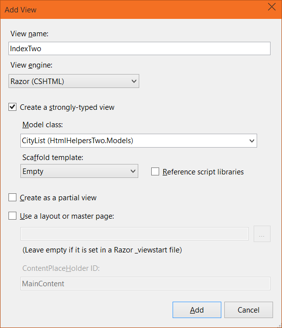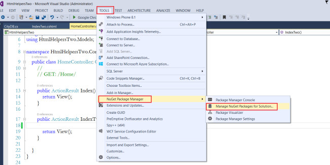 This CityList class is present in HtmlHelpersTwo.Models and HomeController is present in HtmlHelpersTwo.Controllers. So, before creating the instance of this class, we must import the namespace.