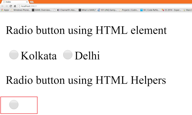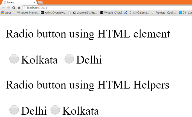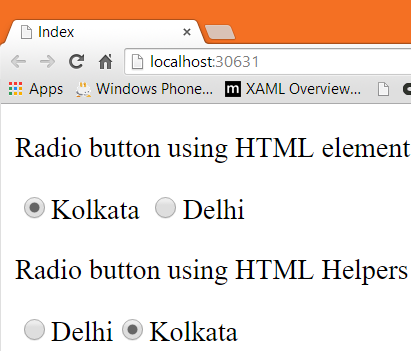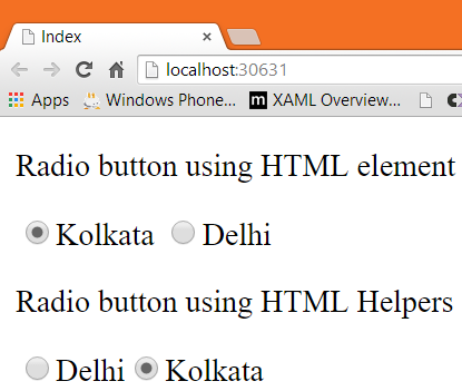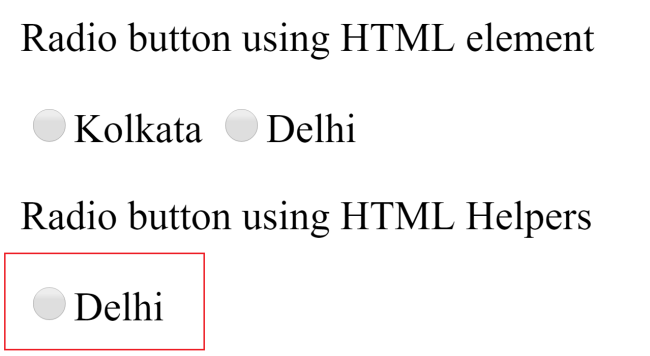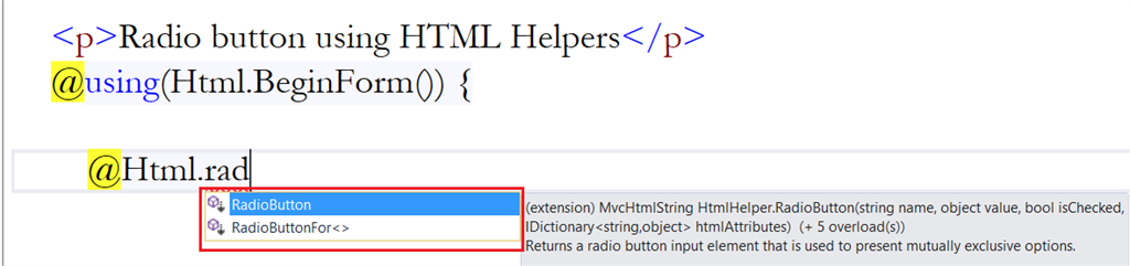 To render a radio button using a HTML helper we can use a RadioButton or RadioButtonFor HTML Helper extension method.