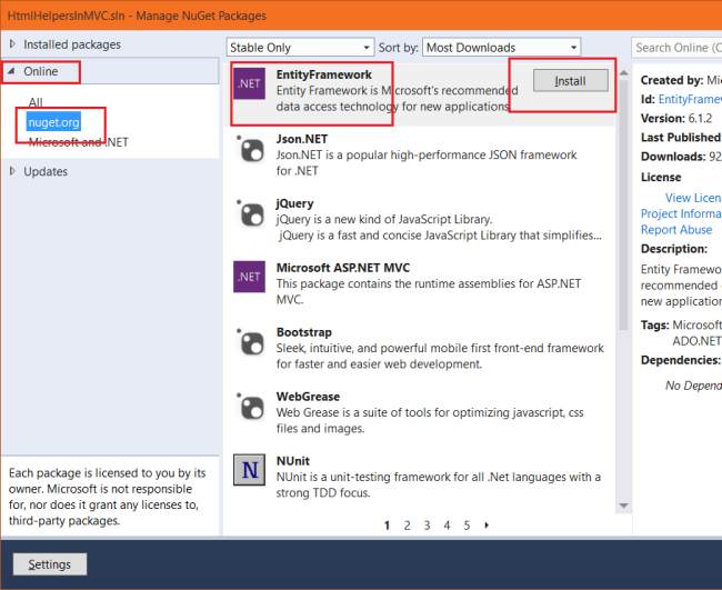 Expand the Online packages then select nugget.org then select Entity Framework then click Install.