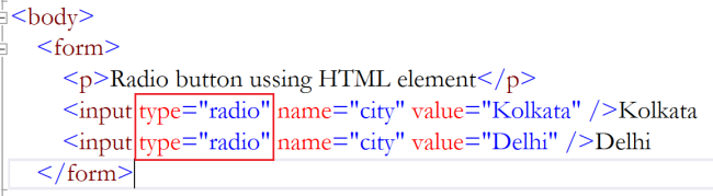 To render a radio button using a HTML element we can use the form input element and pass the type attribute of the input element to the radio.
