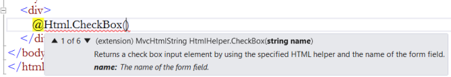 The first overloaded version of the CheckBox extension method expects a parameter of string where we pass the name for the CheckBox control we create.