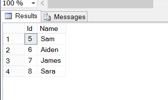 We have added the new records to our table. But there is a slight problem in the Id column. After deleting the old records, the Id column still remembers the last incremented value, in other words 4, and when we insert a new record it increments by 1 and inserts the value 5 and so on. But we want the Id value to start from 1 and for that it is very important to reseed the Identity columns, whenever you delete all the rows.