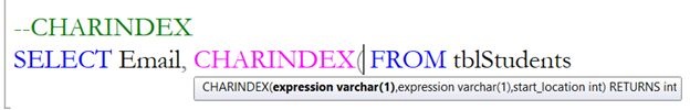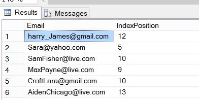- SELECT Email, CHARINDEX('@',Email) AS IndexPosition FROM tblStudents
