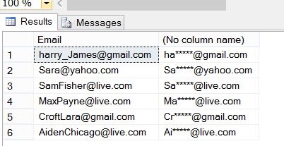 - SELECT Email, SUBSTRING(Email,1,2) + REPLICATE('*',5) + SUBSTRING(Email,CHARINDEX('@',Email),LEN(Email) - CHARINDEX('@',Email)+1)