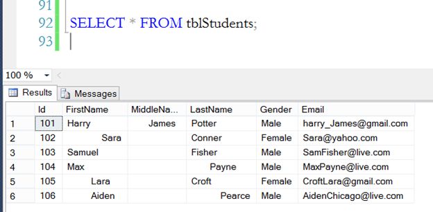- ('Harry ',' James ','Potter ','Male','[email protected]'),