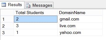 - SELECT COUNT(Email) AS [Total Students], SUBSTRING(Email,CHARINDEX('@',Email)+1,LEN(Email) - CHARINDEX('@',Email)) AS DomainName FROM tblStudents
