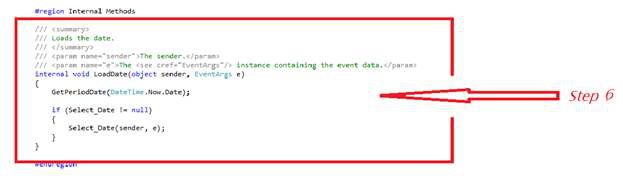 Write the event logic for the SelectedDate Change event on the calendar that will get the selected period of date.