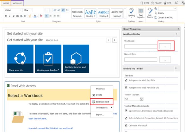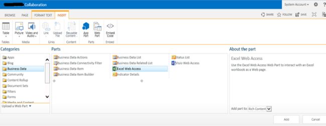 - Click on "Insert" -> "Web part" and select "Excel Web Access web part".