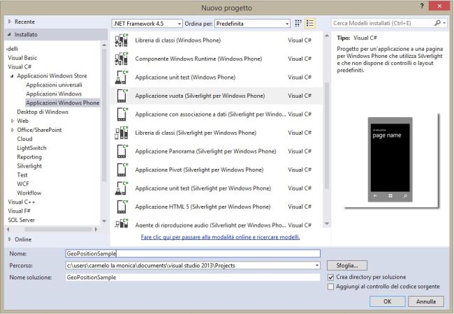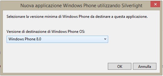 Confirm with the OK button, the next screen we selected a Windows Phone application 8.0.