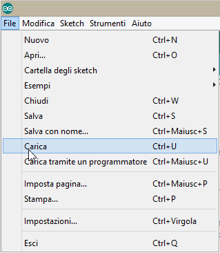 After compiling the Sketch, you can now transfer the code in the Arduino Uno, from the "File" menu, choose the command "Carica". Another way is to mouse-click on the arrow button to the right and then we see the figure.
