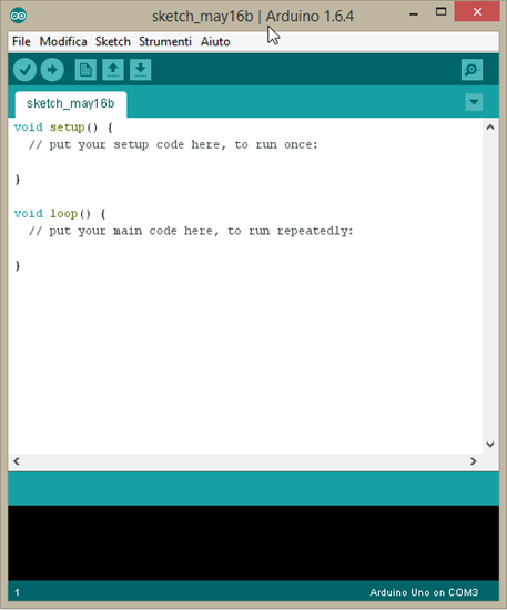 We see that they have two methods, the first called setup() and the second loop(). He said briefly, in the setup() method, we need to provide everything about the initialization required for the operation of the project since it is done only once. All of the remaining code goes in the method loop(), that is executed repeatedly. Another thing is to define the variables globally, in other words, make them visible everywhere and we must declare them to the outside of both methods. First, click with the mouse on the "File", after "Salva con nome", call the project "Temperature Test". After doing that, we paste in the following C++ code.