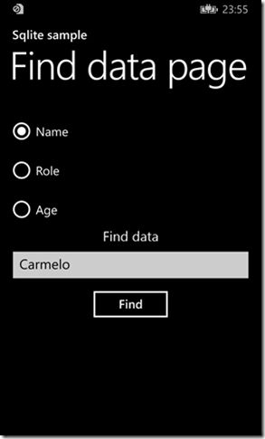 I have inserted these three users in sequence and their information has been memorized inside the tables Employee and Job inside the database people.db. Ended the data input, we go back to the main screen and do a tap on button Find sample page. When we are in the research screen, will see that for pre-defined setting the research is selected for name. We leave so the settings and type in inside the TextBox control the name of a user whom we have inserted previously. Ended the insertion, we do a tap on button Find and if it is found the correspondence when we will be look in the Result screen we will be the information on the user whom we have chosen for the research, we will differently not show anything. I will insert the name "Carmelo", and this and the result of the research.