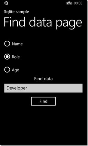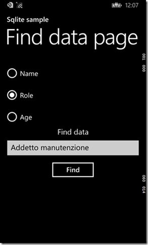We have three Radio Button controls, depending on what was selected, that can execute a research typology. In our case for the name, role and age we will go to type in a term inside the TextBox control, placed under the given TextBlock Find data and at the end of the mediating Button Find insertion will start the research procedure depending on what we have chosen. With the F7 key, we go to the code editor and modify the builder of the class Finddata as follows: