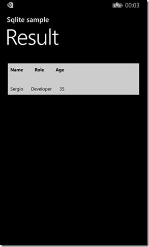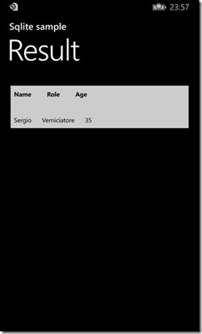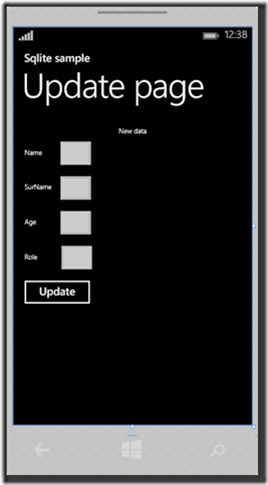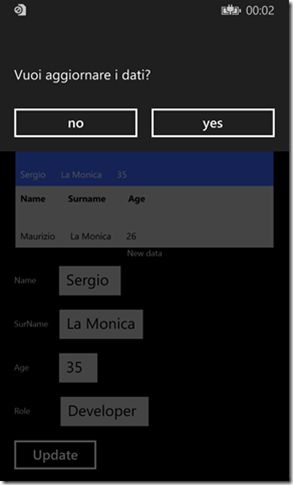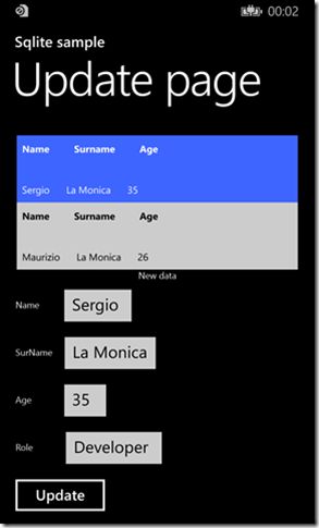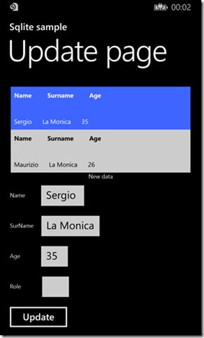 All the possible research combinations have been tried, for name, role and age, with the results that we were expecting in the result screen, everything by the FindForName method that we have inserted in the class DatabaseManagement. There is still a functionality to be tried, that is update of the information that we have inserted. We turn in the main screen and do a tap Update sample page, entered the screen we will show all the information on the users in the ListBox control. We do a tap on an item and TextBox will be increased the value submitting except for that of the duty as visible in the following figures.