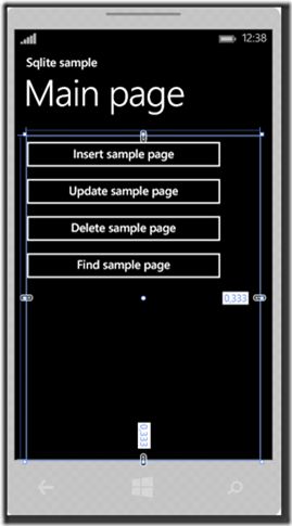 - <Button x:Name="btnInsertSample" Content="Insert sample page" Tapped="btnInsertSample_Tapped" Width="300"/> <Button x:Name="btnUpdateSample" Content="Update sample page" Tapped="btnUpdateSample_Tapped" Width="300"/> <Button x:Name="btnDeleteSample" Content="Delete sample page" Tapped="btnDeleteSample_Tapped" Width="300"/>