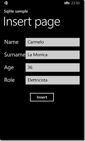 We have finished all the necessary modifications; we can now proceed with the application test. For what we must modify before how see and already explained the compilation target in the first article on ARM platform. We can execute it either from the menu "Build" then choosing" management configuration", or the Toolstrip control selecting the ARM platform from the combobox control. Ended this activity, press key F5 and we start the debug. After the application is begun we do tap on Button Insert sample page. Entered the next screen, we insert one or more increasing the value.