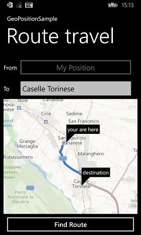 There must already be familiar with, does nothing but add two control pushpins on the map, the first enhanced with the coordinates of our position, in other words "myPushPinStart", and one with the coordinates obtained after the execution of the method QueryAsync () exposed by the RouteQuery class, talk about the control "myPushPinEnd". Finally it remains to be recalled, as previously said, that the method QueryAsync() obtains all the information necessary to be used in the control NokiaMaps.