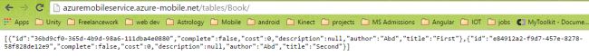 After publishing data, we can check our published service by using GET method of the Mobile service on a Web Browser (you can use Fiddler too for checking GET method of Azure Mobile Services API). When I run my API to GET data in json, it shows data like the following screenshot: