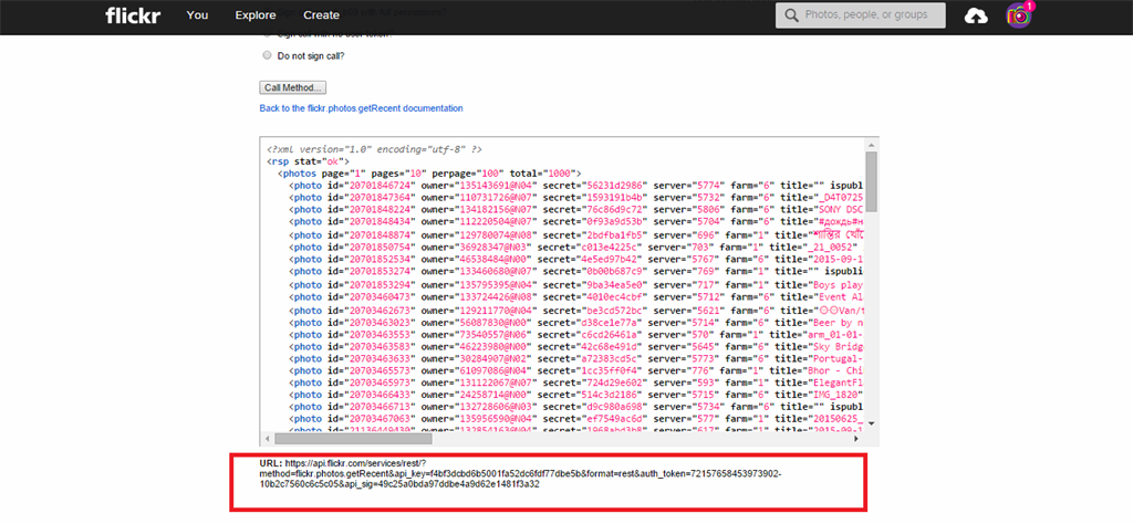 - string provideUri = "https://api.flickr.com/services/rest/?method=flickr.photos.getRecent&api_key=aaf0721010d60c8dfdd2df28ed0ac6b9&format=json&nojsoncallback=1&api_sig=ebb3b6eb5686c1c042a9f8b7d4d4cf87";