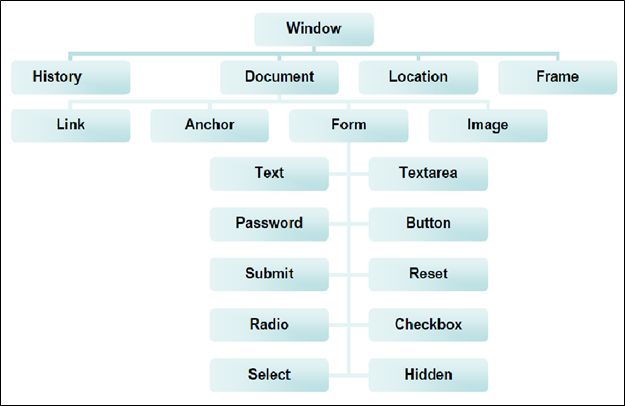 The following figure shows the object hierarchy in JavaScript. All objects have properties and methods, some objects also have "events". Every element on a web page has certain events that can trigger the invocation of event handlers. The "event handler" is a command that is used to specify actions in response to an event. Attributes are inserted into HTML tags to define events and event handlers