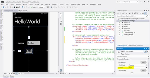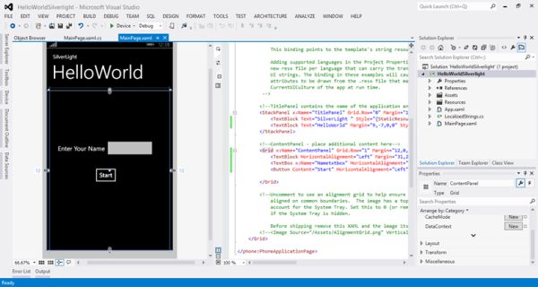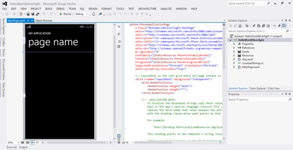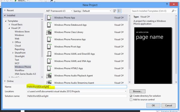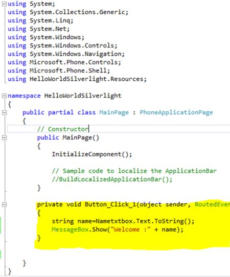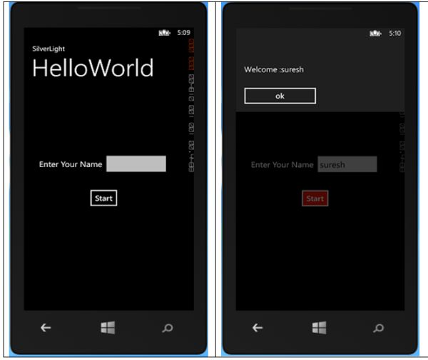 StepsStart your Visual Studio 2012. Select New project to create a new application and name it “HelloWorldSilverlight” or as you wish. The figure is shown below.Click Ok to create the new app. Now we can see a popup as shown in the following screenIn this popup, select your target as Windows Phone app either 7.1 or 8.0. In my case I'm selecting 8.0. Now click Ok to see the Windows Phone 8 interface in the design view with XAML code as shown below.Now drag and drop the controls from the toolbox to get the user input. In my case, we will use a TextBlock, TextBox and Button. The TextBlock is used to show the user as “Enter Your Name” and TextBox is used to get the user input (name it nametxtbox) and Button to trigger some event. Change the button name to “Start “. We can change the control properties in the Properties menu as shown below.After changing some properties our screen will look like this.Now the design part is completed and we will create the code behind “Start” button event. Write the code below to get the user input from the nametxtbox and it provides a welcome message.Simply double-click the “Start” button and it will automatically create the event handler and it go to the coding page. C# Codeusing System;using System.Collections.Generic;using System.Linq;using System.Net;using System.Windows;using System.Windows.Controls;using System.Windows.Navigation;using Microsoft.Phone.Controls;using Microsoft.Phone.Shell;using HelloWorldSilverlight.Resources;namespace HelloWorldSilverlight{ public partial class MainPage : PhoneApplicationPage { // Constructor public MainPage() { InitializeComponent(); } private void Button_Click_1(object sender, RoutedEventArgs e) { string name=Nametxtbox.Text.ToString(); MessageBox.Show("Welcome :" + name); } }}Now build and run the application by pressing the F5 key in your keyboard. We can see the output in the Windows Phone 8 Emulator as shown below. Enter your name in the TextBox and press the “Start” button. In this chapter we finished the “Hello world Silverlight” application in Windows Phone 8 using Visual Studio 2012