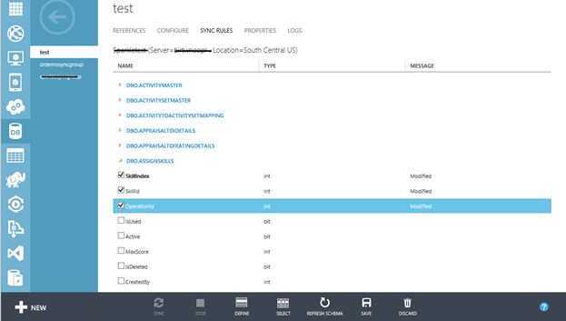 With this procedure your Sync service creation is completed. You can see the status of your service on the Sync dashboard. Now the next step is to configure this Sync service. Sync Service Configuration Once you complete this Sync Service group you need to configure some important details for this service.Automatic Sync: (On / off) this is the trigger if you keep this on then it will automatically start the Sync process in the defined time.Sync Frequency: Here you will specify the time period for the next Sync process start. The minimum time frequency is 5 minutes and the maximum frequency is 1 month.Sync rules In Sync rules you need to select a list of tables / columns from source database. The first time you click on Sync rules it will show you the following message. Click on Define Sync Rules.You will get a list of tables and columns from the source database. Select the appropriate tables or columns that you want to synchronize with the other database. Save your Rules. Now to test you can manually synchronize this database using the Sync button that is given in the following panel. After completion of the Sync process, check your reference and Hub database, you will find the data synchronized depending on your Sync Rules.