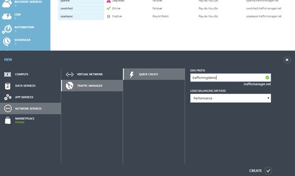 Click Create -> Network Services -> Traffic Manager -> Quick Create then enter the following details.