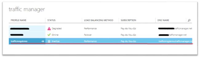 Once you select the appropriate load balancing method, click on the “create” button. It will create a Traffic Manager service for you. For reference see the following screen.