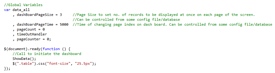 Here in the preceding, we have other global variables like dashBoardPageTime set to 5000 ms, in other words 5 seconds, that is the time interval for the next auto-pagination. These are kind of configuration variables and hence can be placed either in configuration files or in the database itself.