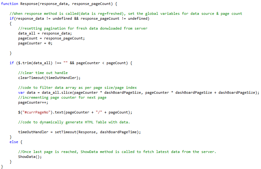 Next, to look into the first if block. This checks for data and page count passed into the function and then assigns these values to the global variables data_all and pageCount respectively and also resets another counter variable pageCounter to 0.