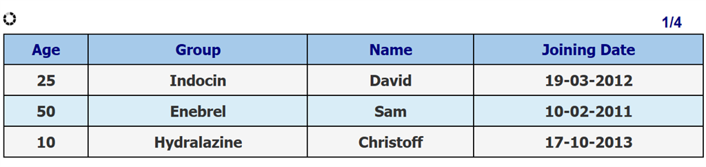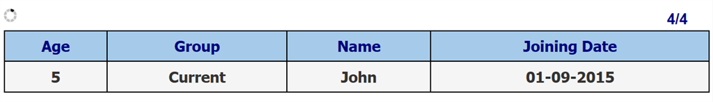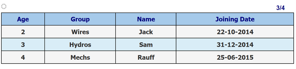 On the load, page 1 has 3 rows (in other words the page size is purely configurable) and is displayed after 5 seconds (in other words the page show time is configurable too), it auto-paginates to page 2 then after 5 seconds, to page 3 and then to page 4 and so on. After 5 seconds on the last page, it again fetches the latest data from the server and again follows the same process of auto-pagination. In this way we are able to show the data in real time where it is updated frequently and the counters or status needs to be refreshed with the same frequency for quick decisions or analysis.