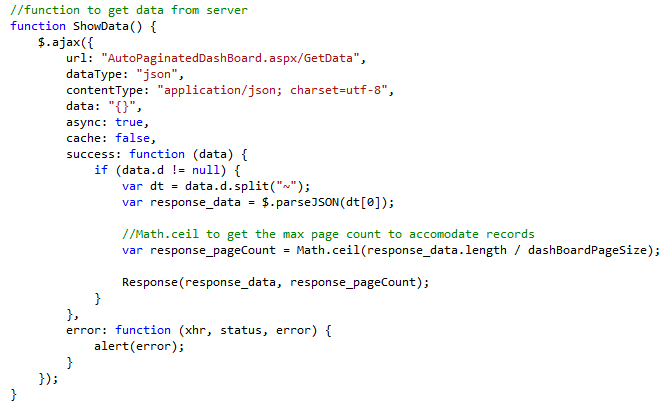 Another important part of this code is the filtering of data for every page. For this purpose, I have use JavaScript's slice method by passing calculated start and end indices as per the pageCounter that is incremented on every pagination until reaching the last page. On reaching the last page, the ShowData() method is executed again.