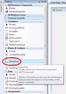The status bar is added from the Toolbox by selecting status strip as shown in the following figure:
