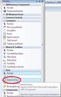 Open Form1 in Design View, you can double-click on the form name form the Solution Explorer. Then from the toolbox select DataGridView as shown in the figure, drag the DataGridView to the form.