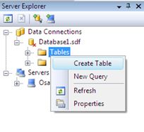 Then go to Server Explorer and expand your database (Database1.sdf) then right-click on "Tables" -> then "Create Table".