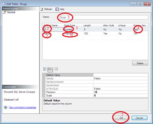 This defines a function for retrieving the contents of the drugs table, we used the SQL command “SELECT * FROM Drugs” then the SqlCeDataAdapter will be used to execute that command and fill a DataTable by output retrieved by the SQL command. The DataTable is the memory version of the database table.