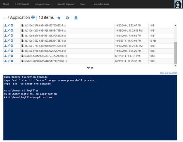 Like we can see in the table, we have a LogFiles folder but this contains some logs (logs from Kudu and the logs in the application). To the logs we saw in the Azure Portal we need to do “cd logfiles” and “cd application” as in the following Figure 6: