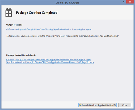 In this case, the packages are created for submission to store and the last panel will show the output path for the package and an option to run the Windows App Certification Kit.