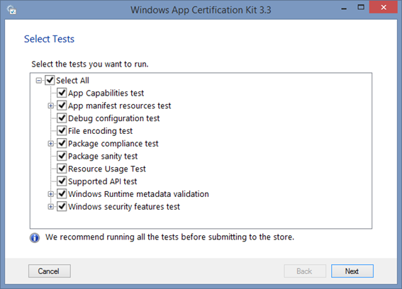 Windows App Certification Kit is an automatic process to verify if the app is okay and it allows selecting which test we want to run. In general, we should select all!