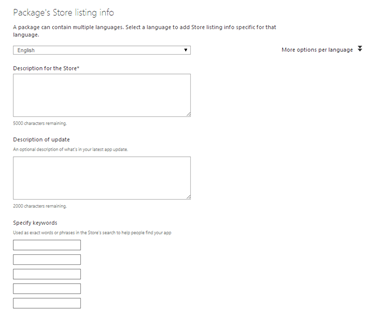 The last step before generating the app (in Windows AppStudio) is Publish, where the user can define the app title, the app description, the language and allows them to connect the app with the store. The following screen showsthe Publish separator: