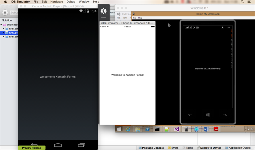In Figure 21, it is possible to see the Android, iOS and Windows Phone applications running at the same time. The Android app is running in Xamarin Android Player, the iOS app is running in the iPhone Simulator and the Windows Phone application is running in a Lumia 1020 device (that is connected to a Windows system running in a Parallels, in a Mac).