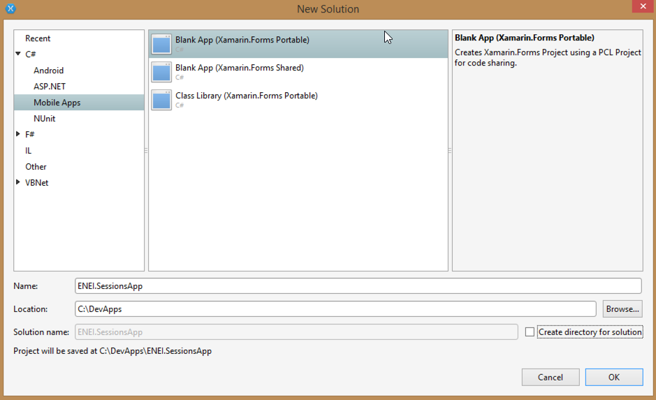 And then create a new Blank App (Xamarin Forms Portable), as in the following: