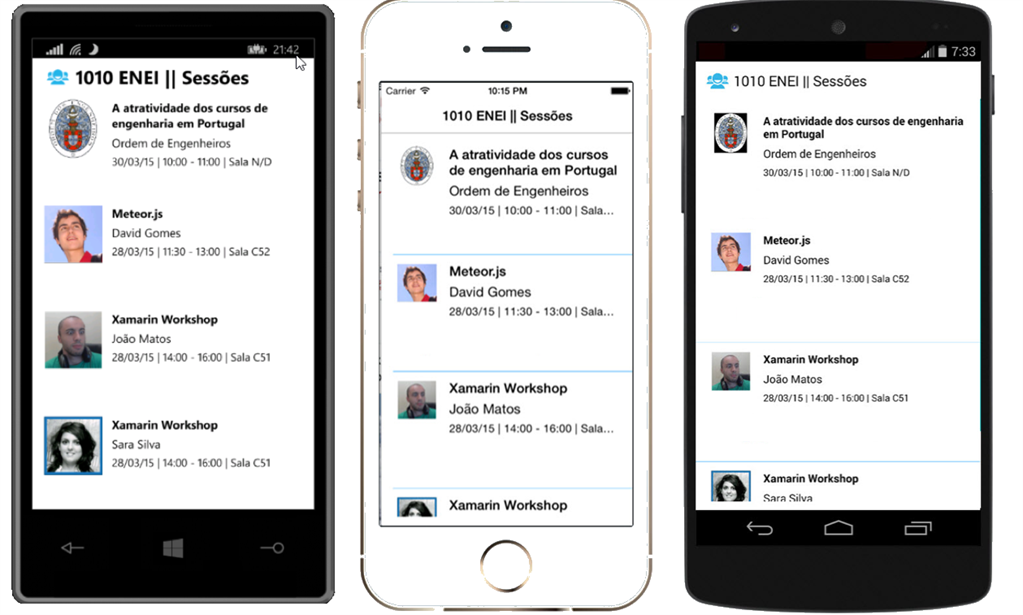 Figure 11: The Windows Phone, iOS and Android application showing sessions from 1010 ENEI3.6. Create the menu for each SessionTo create the menu for each session as described in Figure 12, you need to change the ItemTemplate defined above:
