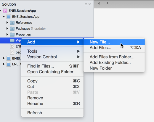 3.1. Create the XAML pageIn Xamarin Studio, select the ENEI.SessionsApp project and create a folder called “Views”, as described in Figure 1 and Figure 2.