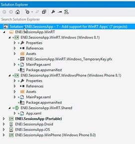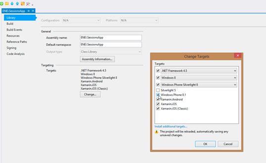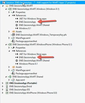 This error means that the ENEI.SessionsApp is a Portable Class Library (PCL) that does not have support for Windows Phone 8.1 (WinRT). This way, you need to change the PCL project (in Properteis) to support this target, as described in Figure 6: