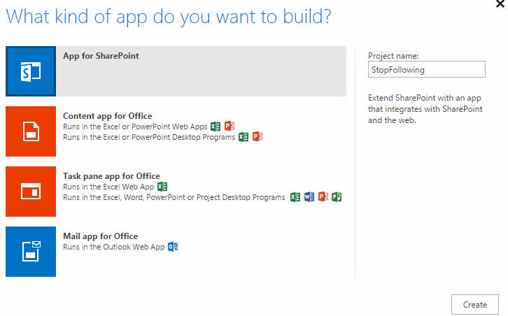 - Choose the App for SharePoint template, name the project and then click the Create button
