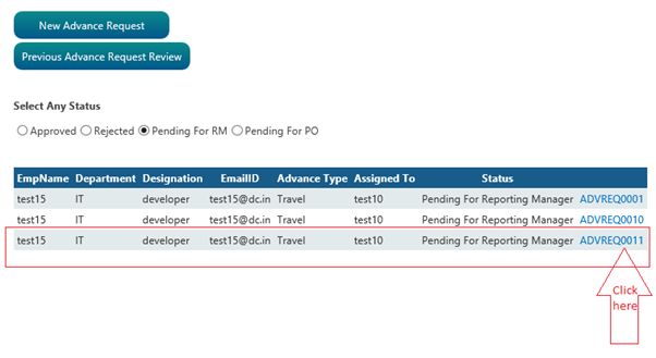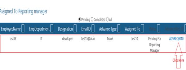 The underlined area shows the task that is created with the following Advance Request Id (ADVREQ0010) and it should be approved or rejected by the Reporting Manager (Test10).